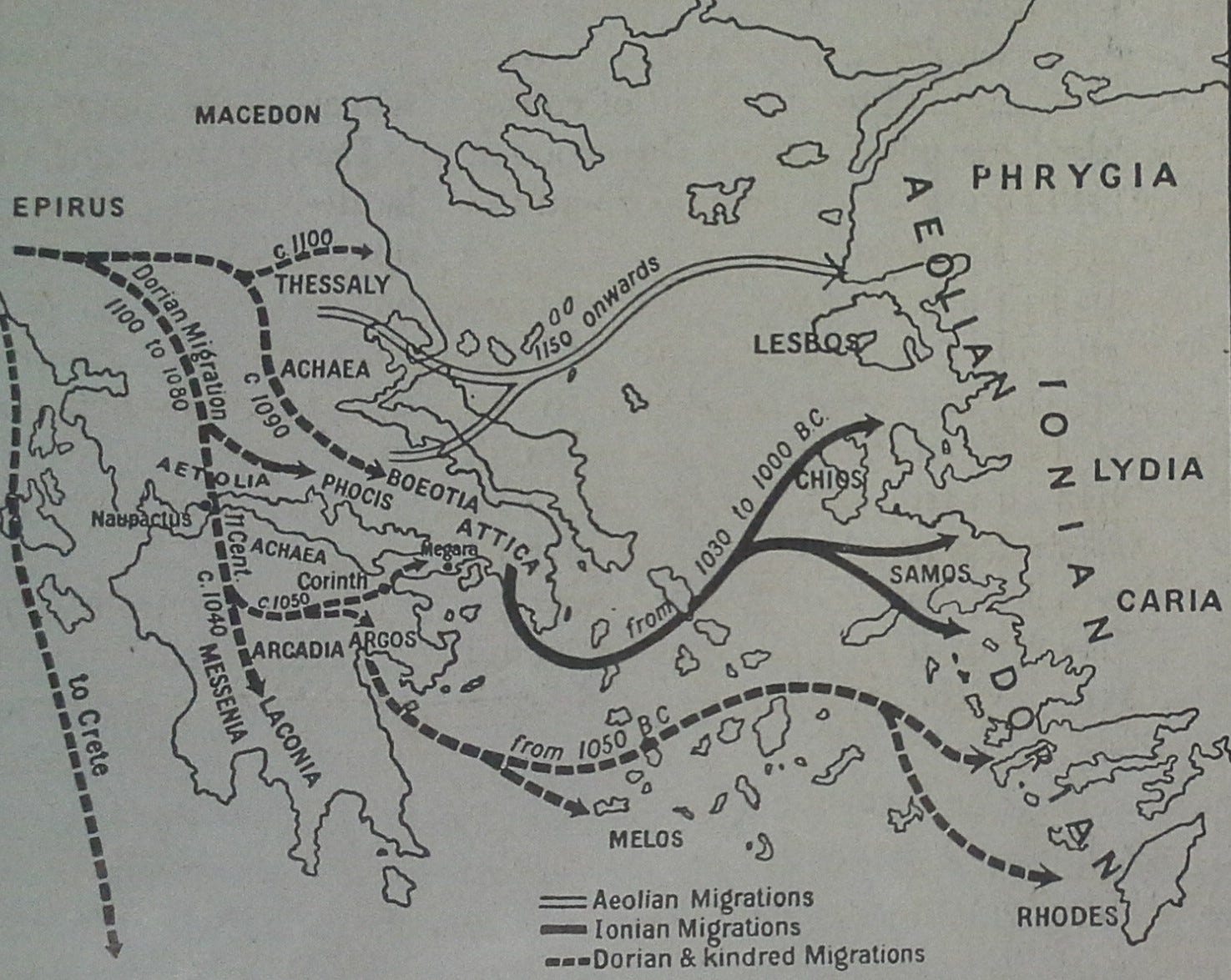 What followed was the Greek Dark Age, lasting from c. 1100–800 BCE. Literacy vanished and the social structure became far less centralized. During this time the Greek-speaking Dorians, the ancestors of the Spartans who claimed descent from Herakles, moved down into Greece, settling in Sparta and across the Peloponnese. The Greek Ionians also moved east, colonizing the coast of Asia Minor.